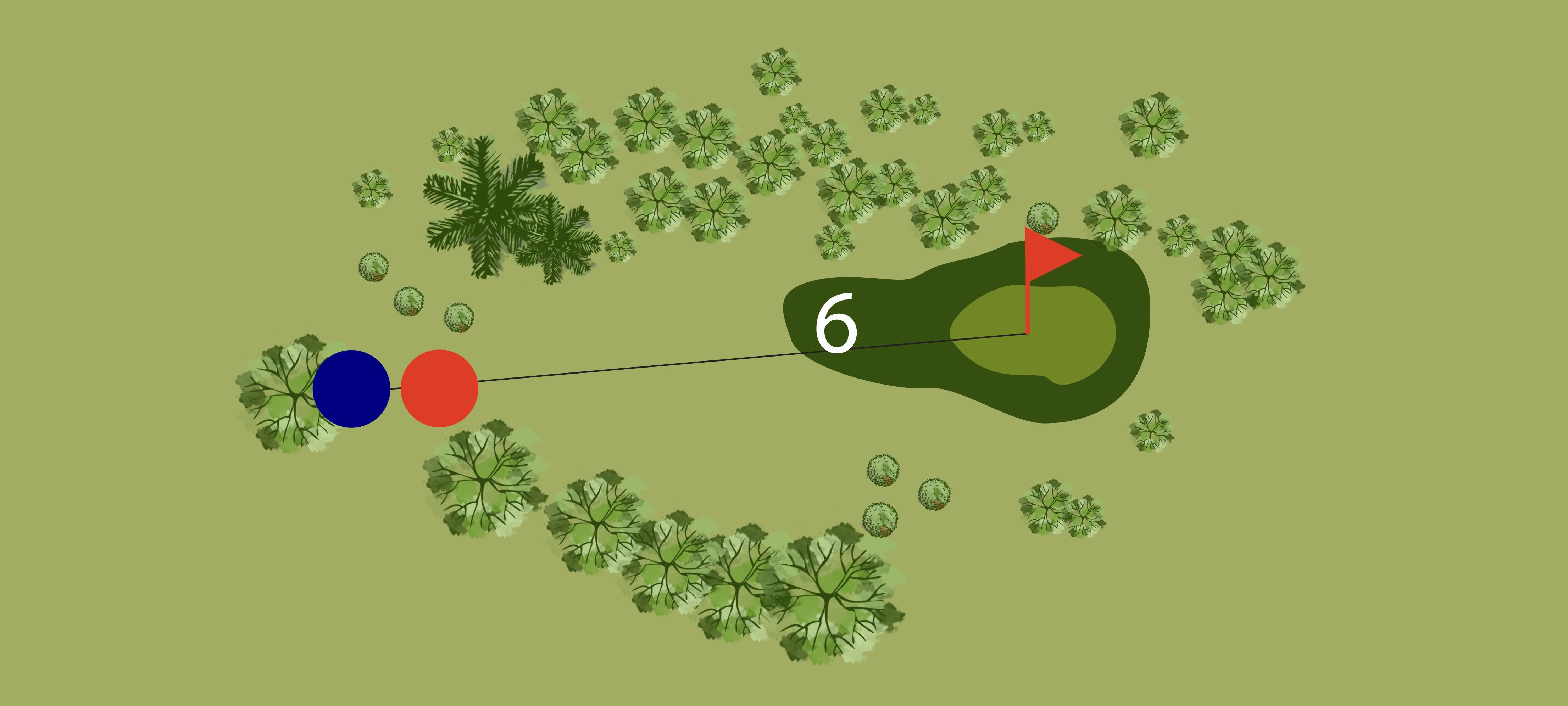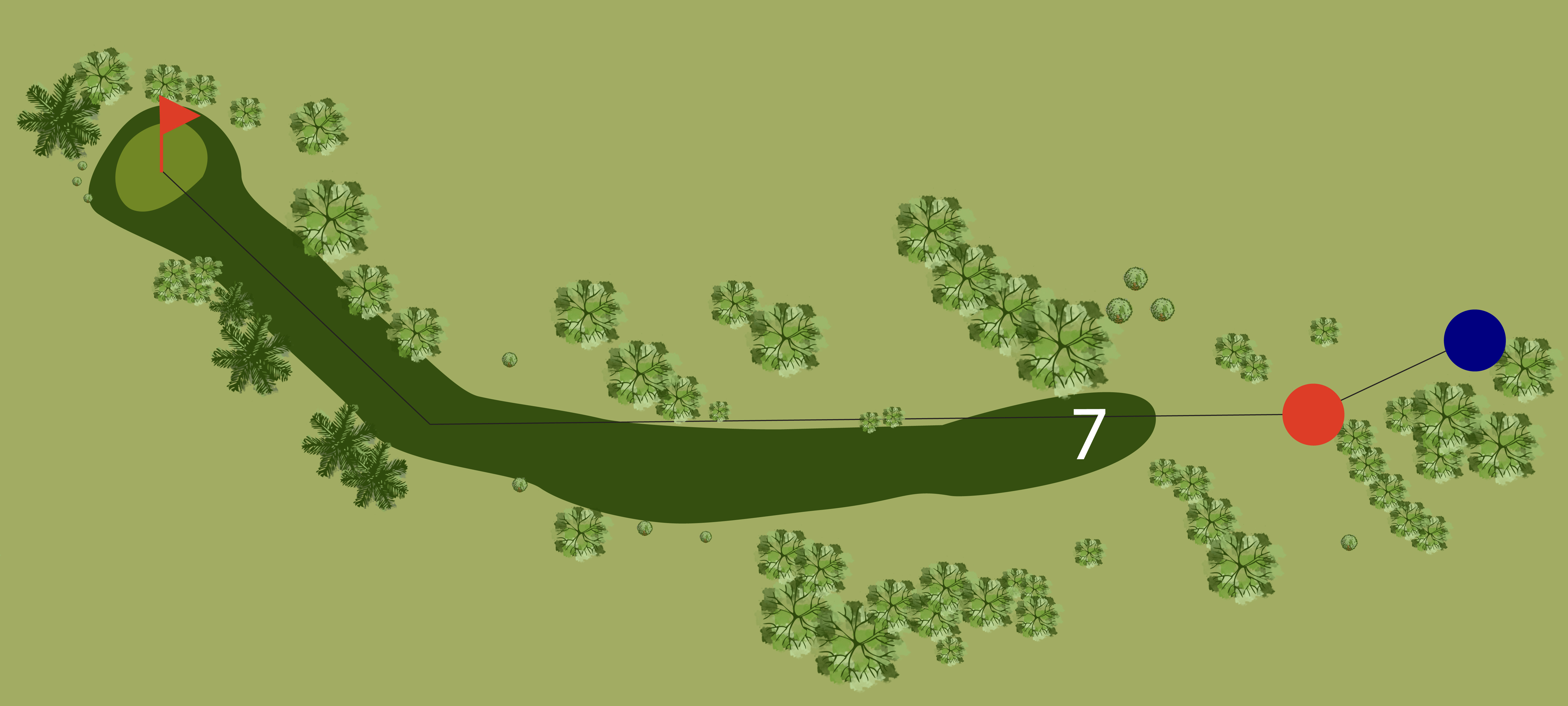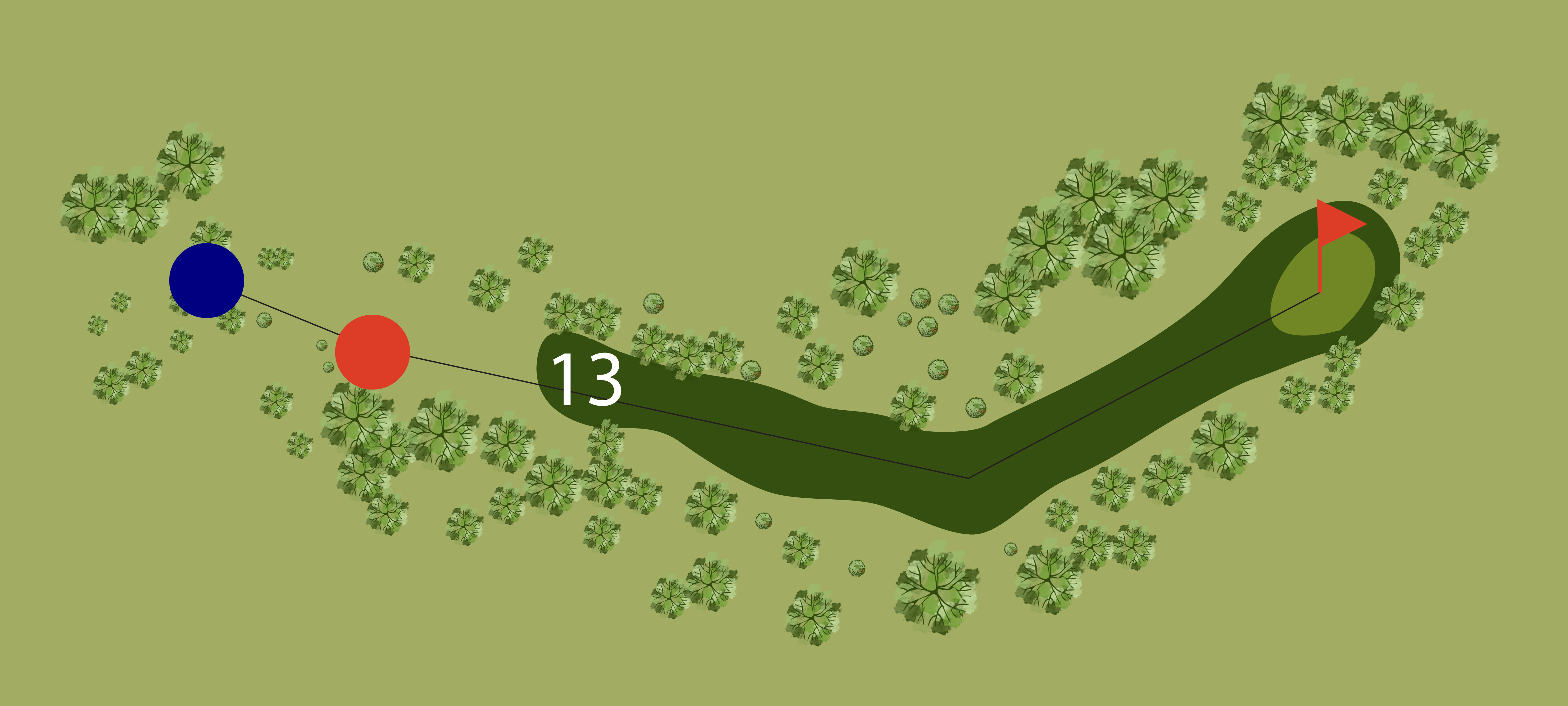 An elevated tee provides the opportunity for the brave to take on the direct route to the small green on this short dogleg left. Beware the deep hollows and mounds. |