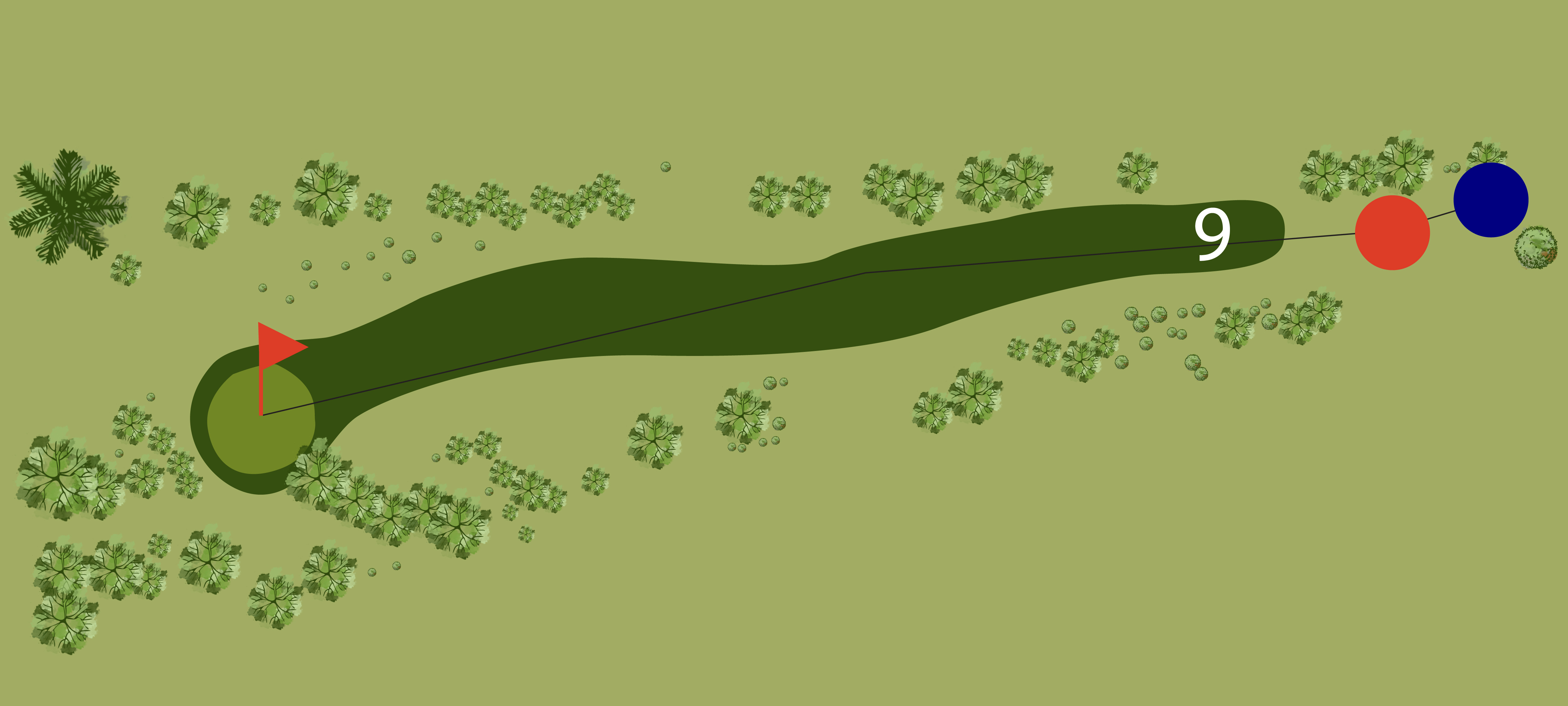 A semi circle hole with deep hollows on right. Third shot is played into an elevated 2 tiered putting surface. |